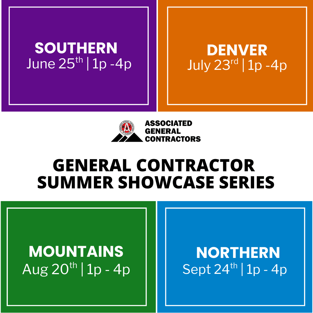 Don't miss out on AGC's General Contractor Summer Showcase Series! AGC will host four events in total in four different regions, June through September! The July showcase will be in Denver! Each showcase will have GC booths where you can meet the folks responsible for buying out projects, as well as enjoy food and beverages and networking with other attendees! Register now before the event sells out! To reserve your GC booth, explore sponsorship opportunities, or general registration questions, please contact Sarah at sarahk@agccolorado.org!